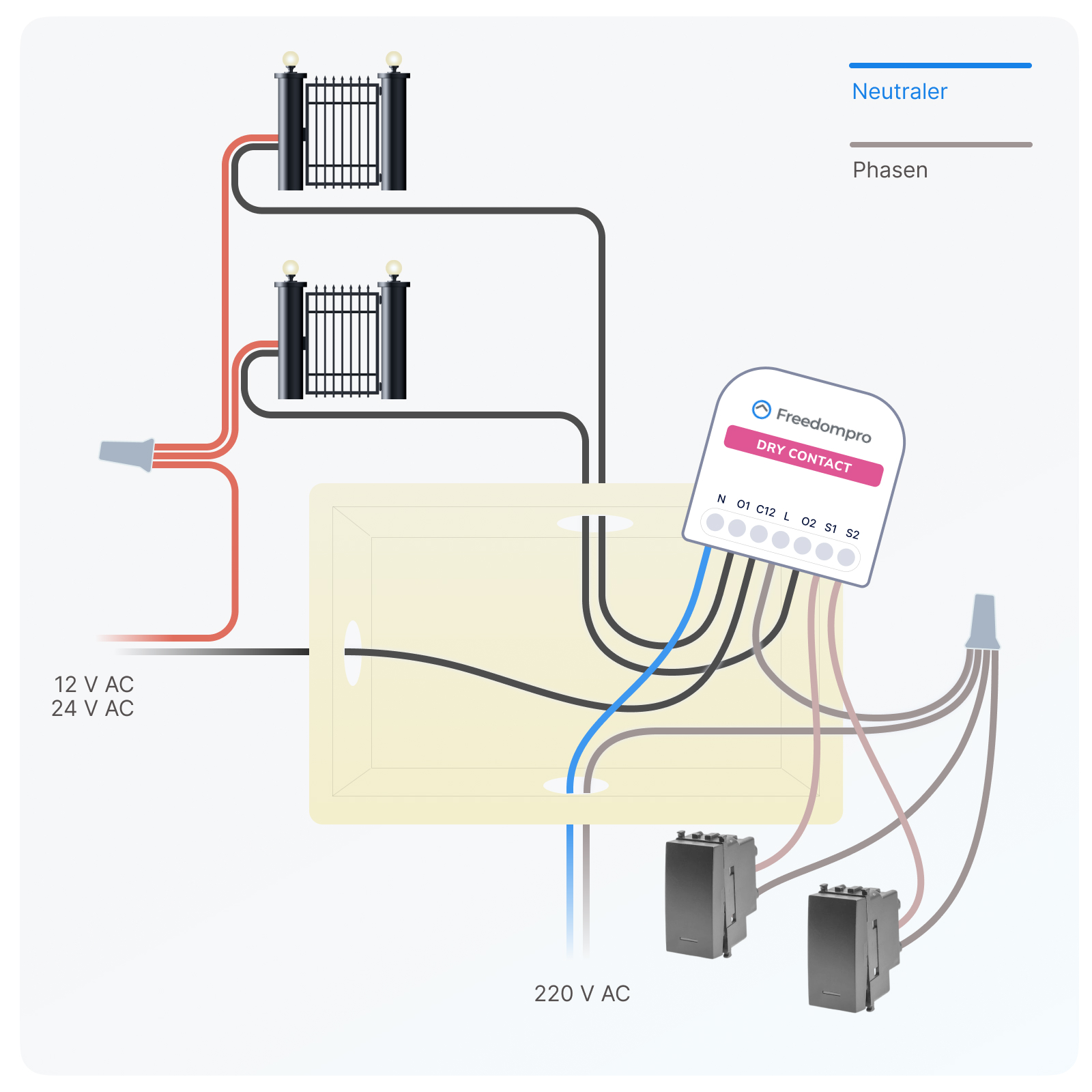 Das Modul sollte direkt mit dem Impulsgeber, beispielsweise einem Motor oder einem Schloss, und auch mit den physischen Tasten, falls vorhanden, verbunden werden.